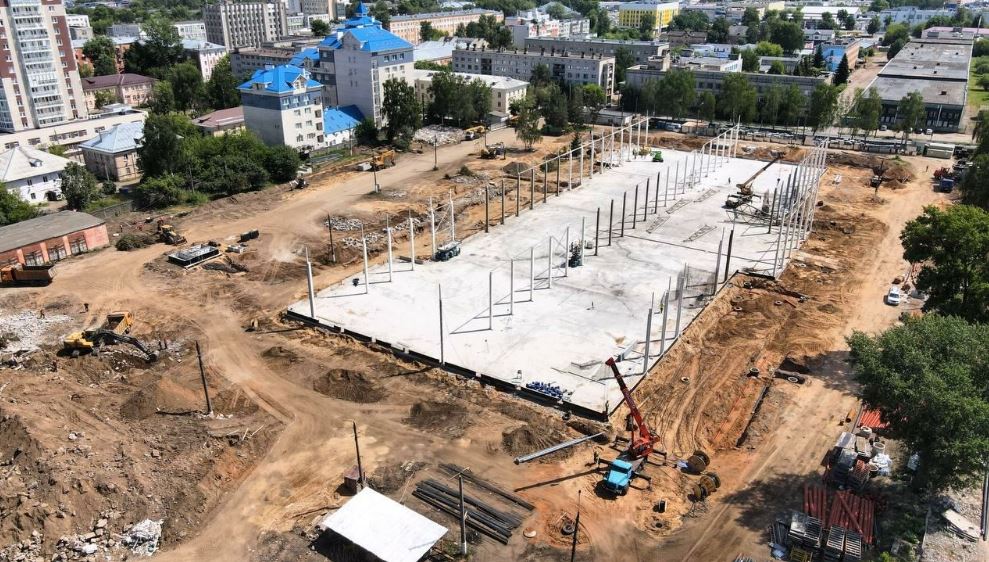 Сейчас на площадке ведётся монтаж сэндвич-панелей по периметру здания, армирование стен, устройство опалубки и бетонирование лестничных клеток, ведущих на 2 этаж здания музея, выполняются работы по обустройству ливневой канализации, тепловой сети, электроснабжения, вентиляции, благоустраивается территория парка. Работы ведутся в три смены, в них задействовано 127 человек и 20 единиц техники.